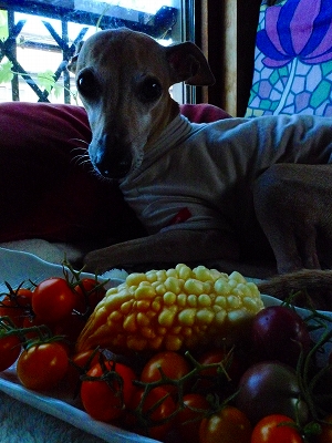 昨年までで懲りたのか収穫野菜たちとの撮影を完全拒否のアロマくん。。