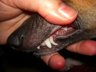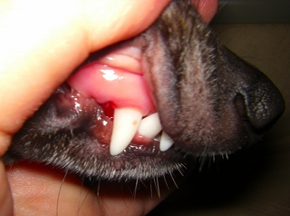 口をあけてみると右上犬歯があらぬ方向に傾いて血がにじんでいたのです