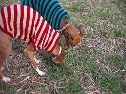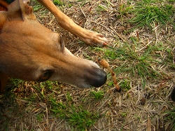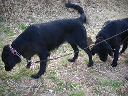 必死に草をハムハムしてるシマシマ犬2と黒犬2