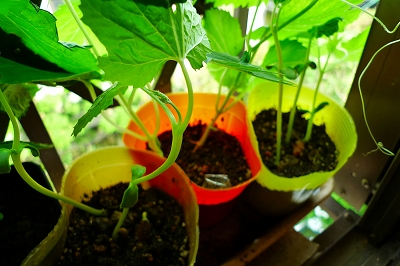 この二つの苗は我が家に残して寝室側の窓際に植え替えました。