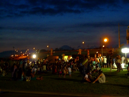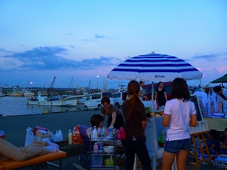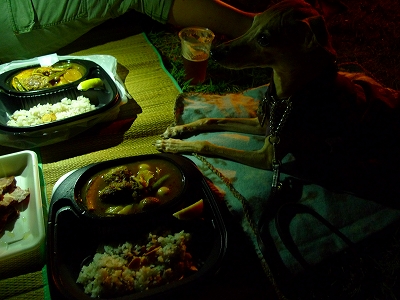 けむりカレーとビールが浜風にマッチしてました。暗くてあやしげなナイトピクニックでしたが(笑)