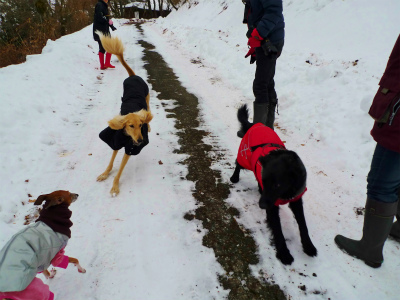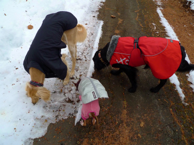 雪道散歩のあとは飼い主たちのランチタイム