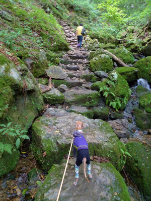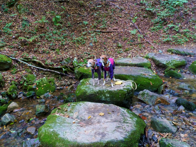 よい感じに川のあいだに置かれたおおきな岩を何度も飛び越えて